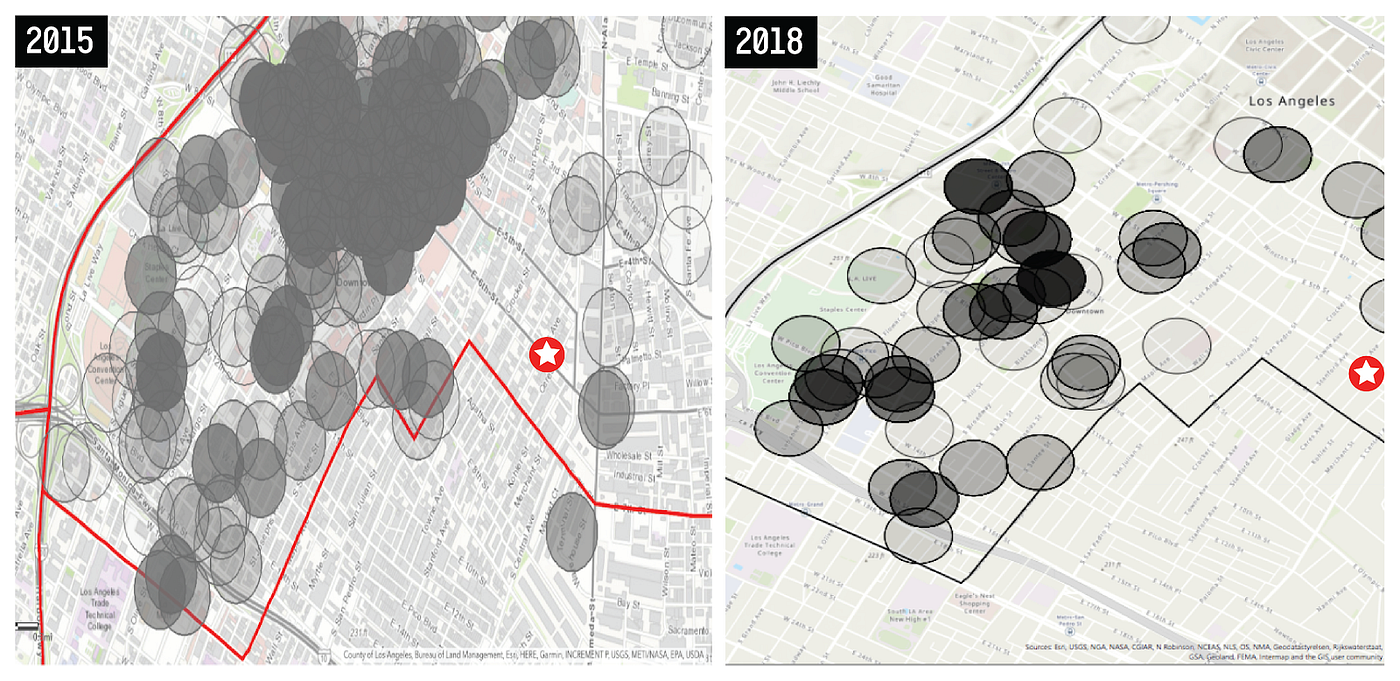 The dominant critique of Predpol is that this form of data-driven policing creates harmful feedback loops. Biased crime data, collected from already hyper-policed communities, is fed into the algorithm, so the algorithm would necessarily determine that crime is occurring most in these same hyper-policed areas where the data was invented. On November 8th, 2018, LAPD released hotspot maps of Central Division from June 21st to December 31st, 2015, and another from March through June, 2018. The Coalition analyzed these records and created density maps to visualize where hotspots occurred over time.